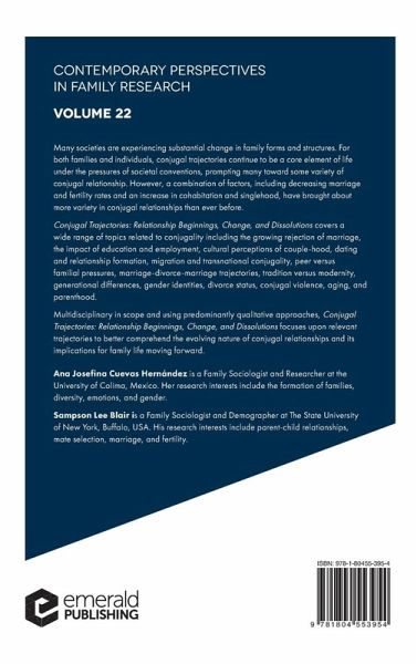 Multidisciplinary in scope and using predominantly qualitative approaches, Conjugal Trajectories: Relationship Beginnings, Change, and Dissolutions focuses upon relevant trajectories to better comprehend the evolving nature of conjugal relationships and its implications for family life moving forward.
