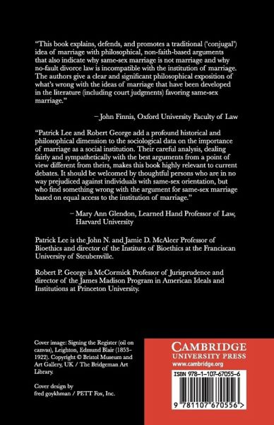 This book defends the conjugal view of marriage. Patrick Lee and Robert P. George argue that marriage is a distinctive type of community: the union of a man and a woman who have committed to sharing their lives on every level of their beings (bodily, emotionally, and spiritually) in the kind of union that would be fulfilled by conceiving and rearing children together. The comprehensive nature of this union, and its intrinsic orientation to procreation as its natural fulfillment, distinguishes marriage from other types of community and provides the basis for the norms of marital exclusivity and permanence. Lee and George detail how the basic moral norms regarding sexual acts follow from the ethical requirement to respect the good of marriage and explain how the law should treat marriage, given its conjugal nature, examining both the same-sex-marriage issue and civil divorce.