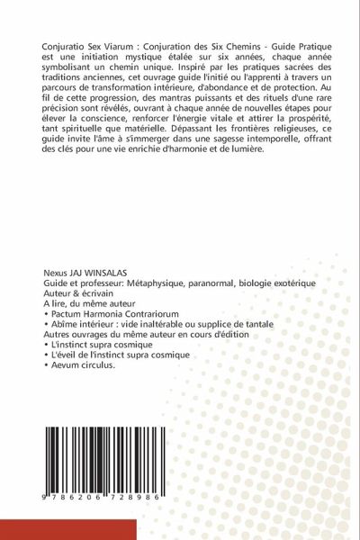 Conjuratio Sex Viarum : Conjuration des Six Chemins - Guide Pratique est une initiation mystique étalée sur six années, chaque année symbolisant un chemin unique. Inspiré par les pratiques sacrées des traditions anciennes, cet ouvrage guide l'initié ou l'apprenti à travers un parcours de transformation intérieure, d'abondance et de protection. Au fil de cette progression, des mantras puissants et des rituels d'une rare précision sont révélés, ouvrant à chaque année de nouvelles étapes pour élever la conscience, renforcer l'énergie vitale et attirer la prospérité, tant spirituelle que matérielle. Dépassant les frontières religieuses, ce guide invite l'âme à s'immerger dans une sagesse intemporelle, offrant des clés pour une vie enrichie d'harmonie et de lumière.