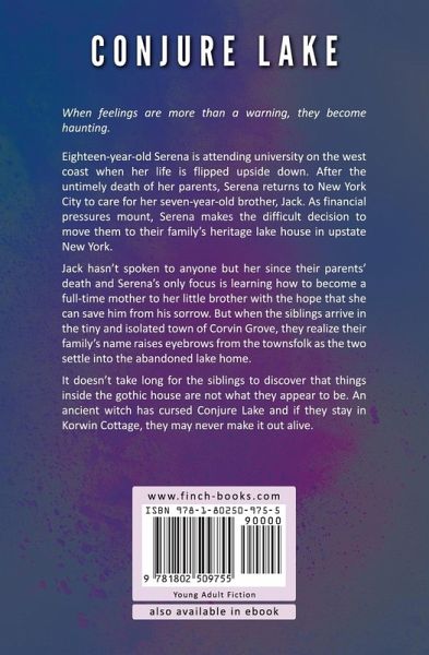 When feelings are more than a warning, they become haunting. Eighteen-year-old Serena is attending university on the west coast when her life is flipped upside down. After the untimely death of her parents, Serena returns to New York City to care for her seven-year-old brother, Jack. As financial pressures mount, Serena makes the difficult decision to move them to their family's heritage lake house in upstate New York. Jack hasn't spoken to anyone but her since their parents' death and Serena's only focus is learning how to become a full-time mother to her little brother with the hope that she can save him from his sorrow. But when the siblings arrive in the tiny and isolated town of Corvin Grove, they realize their family's name raises eyebrows from the townsfolk as the two settle into the abandoned lake home. It doesn't take long for the siblings to discover that things inside the gothic house are not what they appear to be. An ancient witch has cursed Conjure Lake and if they stay in Korwin Cottage, they may never make it out alive.