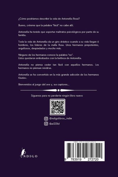 ¿Cómo podríamos describir la vida de Antonella Rossi? Bueno, créeme que la palabra "fácil" no cabe allí. Antonella ha tenido que soportar maltratos psicológicos por parte de su familia. Toda la vida de Antonella da un giro drástico cuando a su vida llegan 6 hombres, los líderes de la mafia Rusa. Unos hermanos prepotentes, orgullosos, despiadados y mucho más. Ninguno de los hermanos conoce la palabra "no". Estos quedaron embobados con la belleza de Antonella. Antonella no piensa ceder tan fácil con aquellos hermanos. Los hermanos no piensan rendirse. Antonella se ha convertido en la más grande adicción de los hermanos Kiselev. Bienvenidos al juego del ave y, sus captores