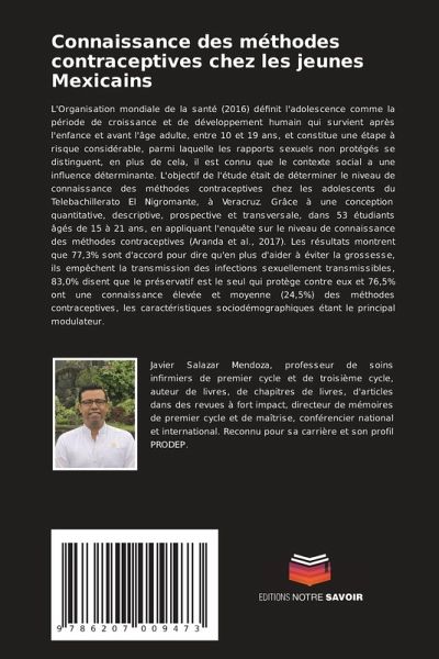 L'Organisation mondiale de la santé (2016) définit l'adolescence comme la période de croissance et de développement humain qui survient après l'enfance et avant l'âge adulte, entre 10 et 19 ans, et constitue une étape à risque considérable, parmi laquelle les rapports sexuels non protégés se distinguent, en plus de cela, il est connu que le contexte social a une influence déterminante. L'objectif de l'étude était de déterminer le niveau de connaissance des méthodes contraceptives chez les adolescents du Telebachillerato El Nigromante, à Veracruz. Grâce à une conception quantitative, descriptive, prospective et transversale, dans 53 étudiants âgés de 15 à 21 ans, en appliquant l'enquête sur le niveau de connaissance des méthodes contraceptives (Aranda et al., 2017). Les résultats montrent que 77,3% sont d'accord pour dire qu'en plus d'aider à éviter la grossesse, ils empêchent la transmission des infections sexuellement transmissibles, 83,0% disent que le préservatif est le seul qui protège contre eux et 76,5% ont une connaissance élevée et moyenne (24,5%) des méthodes contraceptives, les caractéristiques sociodémographiques étant le principal modulateur.