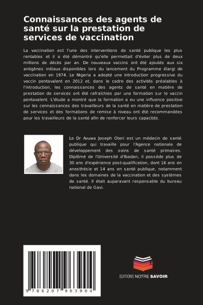 La vaccination est l'une des interventions de santé publique les plus rentables et il a été démontré qu'elle permettait d'éviter plus de deux millions de décès par an. De nouveaux vaccins ont été ajoutés aux six antigènes initiaux disponibles lors du lancement du Programme élargi de vaccination en 1974. Le Nigeria a adopté une introduction progressive du vaccin pentavalent en 2012 et, dans le cadre des activités préalables à l'introduction, les connaissances des agents de santé en matière de prestation de services ont été rafraîchies par une formation sur le vaccin pentavalent. L'étude a montré que la formation a eu une influence positive sur les connaissances des travailleurs de la santé en matière de prestation de services et des formations de remise à niveau ont été recommandées pour les travailleurs de la santé afin de renforcer leurs capacités.