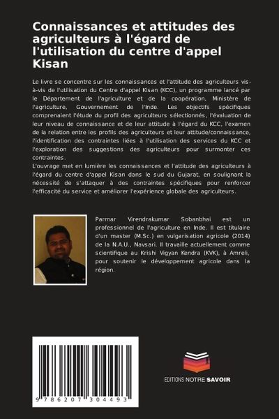Le livre se concentre sur les connaissances et l'attitude des agriculteurs vis-à-vis de l'utilisation du Centre d'appel Kisan (KCC), un programme lancé par le Département de l'agriculture et de la coopération, Ministère de l'agriculture, Gouvernement de l'Inde. Les objectifs spécifiques comprenaient l'étude du profil des agriculteurs sélectionnés, l'évaluation de leur niveau de connaissance et de leur attitude à l'égard du KCC, l'examen de la relation entre les profils des agriculteurs et leur attitude/connaissance, l'identification des contraintes liées à l'utilisation des services du KCC et l'exploration des suggestions des agriculteurs pour surmonter ces contraintes.L'ouvrage met en lumière les connaissances et l'attitude des agriculteurs à l'égard du centre d'appel Kisan dans le sud du Gujarat, en soulignant la nécessité de s'attaquer à des contraintes spécifiques pour renforcer l'efficacité du service et améliorer l'expérience globale des agriculteurs.