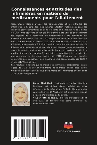 Cette étude visait à évaluer les connaissances et les attitudes des infirmières à l'égard des médicaments affectant l'allaitement dans les cliniques gouvernementales de soins de santé primaires (SSP) de la bande de Gaza. Une approche analytique descriptive a été utilisée pour atteindre les objectifs de la recherche. Un questionnaire a été administré aux infirmières travaillant dans les 24 cliniques de soins de santé primaires sous l'administration du ministère de la santé (MOH) dans la bande de Gaza. L'échantillon de l'étude a été sélectionné au hasard et se composait de 150 infirmières actuellement employées dans les cliniques gouvernementales de soins de santé primaires de la bande de Gaza. Le chercheur a utilisé un modèle transversal quantitatif, descriptif et analytique, la collecte des données ayant eu lieu entre avril et juin 2018. L'analyse des données comprenait des fréquences, des moyennes, des pourcentages, des tests T et une ANOVA à une voie.Les résultats indiquent que la moitié des infirmières participantes étaient âgées de 31 à 40 ans et que moins de la moitié d'entre elles étaient titulaires d'un baccalauréat. Plus de la moitié des infirmières avaient entre 11 et 20 ans d'expérience.