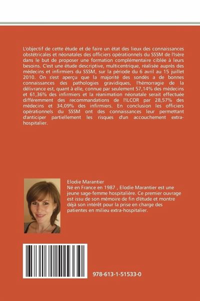 L'objectif de cette étude et de faire un état des lieux des connaissances obstétricales et néonatales des officiers opérationnels du SSSM de l'Isère dans le but de proposer une formation complémentaire ciblée à leurs besoins. C'est une étude descriptive, multicentrique, réalisée auprès des médecins et infirmiers du SSSM, sur la période du 6 avril au 15 juillet 2010. On s'est aperçu que la majorité des sondés a de bonnes connaissances des pathologies gravidiques, l'hémorragie de la délivrance est, quant à elle, connue par seulement 57,14% des médecins et 61,36% des infirmiers et la réanimation néonatale serait effectuée différemment des recommandations de l'ILCOR par 28,57% des médecins et 34,09% des infirmiers. En conclusion les officiers opérationnels du SSSM ont des connaissances leur permettant d'anticiper partiellement les risques d'un accouchement extra-hospitalier.