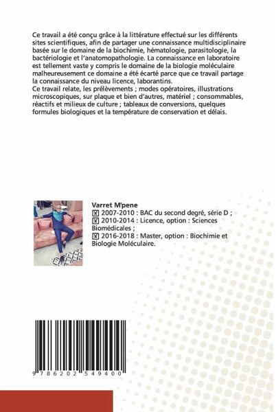 Ce travail a été conçu grâce à la littérature effectué sur les différentssites scientifiques, afin de partager une connaissance multidisciplinairebasée sur le domaine de la biochimie, hématologie, parasitologie, labactériologie et l'anatomopathologie. La connaissance en laboratoireest tellement vaste y compris le domaine de la biologie moléculairemalheureusement ce domaine a été écarté parce que ce travail partagela connaissance du niveau licence, laborantins. Ce travail relate, les prélèvements ; modes opératoires, illustrationsmicroscopiques, sur plaque et bien d'autres, matériel ; consommables,réactifs et milieux de culture ; tableaux de conversions, quelquesformules biologiques et la température de conservation et délais.