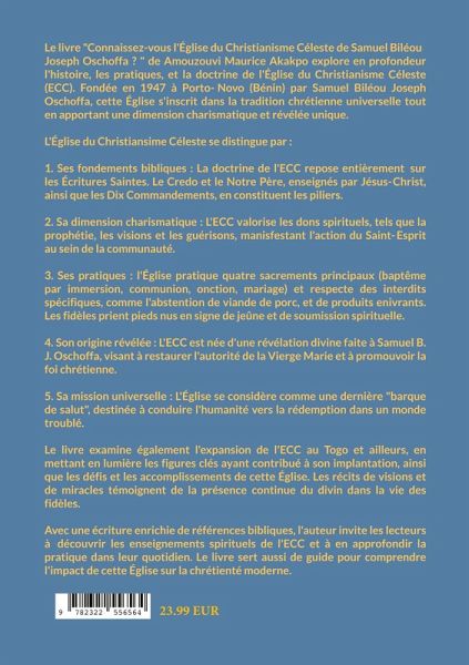 Le livre "Connaissez-vous l'Église du Christianisme Céleste de Samuel Biléou Joseph Oschoffa ? " de Amouzouvi Maurice Akakpo explore en profondeur l'histoire, les pratiques, et la doctrine de l'Église du Christianisme Céleste (ECC). Fondée en 1947 à Porto-Novo (Bénin) par Samuel Biléou Joseph Oschoffa, cette Église s'inscrit dans la tradition chrétienne universelle tout en apportant une dimension charismatique et révélée unique. L'Église du Christiansime Céleste se distingue par : 1. Ses fondements bibliques : La doctrine de l'ECC repose entièrement sur les Écritures Saintes. Le Credo et le Notre Père, enseignés par Jésus-Christ, ainsi que les Dix Commandements, en constituent les piliers. 2. Sa dimension charismatique : L'ECC valorise les dons spirituels, tels que la prophétie, les visions et les guérisons, manisfestant l'action du Saint-Esprit au sein de la communauté. 3. Ses pratiques : l'Église pratique quatre sacrements principaux (baptême par immersion, communion, onction, mariage) et respecte des interdits spécifiques, comme l'abstention de viande de porc et de produits enivrants. Les fidèles prient pieds nus en signe de jeûne et de soumission spirituelle. 4. Son origine révélée : L'ECC est née d'une révélation divine faite à Samuel B. J. Oschoffa, visant à restaurer l'autorité de la Vierge Marie et à promouvoir la foi chrétienne. 5. Sa mission universelle : L'Église se considère comme une dernière "barque de salut", destinée à conduire l'humanité vers la rédemption dans un monde troublé. Le livre examine également l'expansion de l'ECC au Togo et ailleurs, en mettant en lumière les figures clés ayant contribué à son implantation, ainsi que les défis et les accomplissements de cette Église. Les récits de visions et de miracles témoignent de la présence continue du divin dans la vie des fidèles. Avec une écriture enrichie de références bibliques, l'auteur invite les lecteurs à découvrir les enseignements spirituels de l'ECC et à en approfondir la pratique dans leur quotidien. Le livre sert aussi de guide pour comprendre l'impact de cette Église sur la chrétienté moderne.
