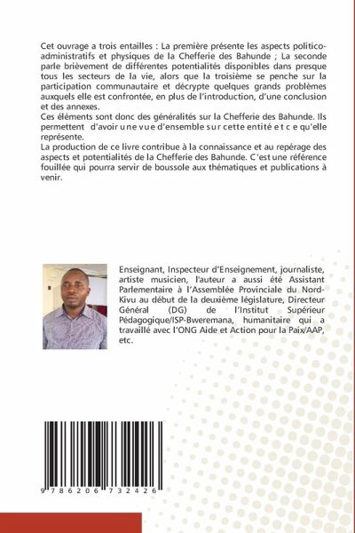 Cet ouvrage a trois entailles : La première présente les aspects politico-administratifs et physiques de la Chefferie des Bahunde ; La seconde parle brièvement de différentes potentialités disponibles dans presque tous les secteurs de la vie, alors que la troisième se penche sur la participation communautaire et décrypte quelques grands problèmes auxquels elle est confrontée, en plus de l'introduction, d'une conclusion et des annexes.Ces éléments sont donc des généralités sur la Chefferie des Bahunde. Ils permettent d'avoir une vue d'ensemble sur cette entité et ce qu'elle représente. La production de ce livre contribue à la connaissance et au repérage des aspects et potentialités de la Chefferie des Bahunde. C'est une référence fouillée qui pourra servir de boussole aux thématiques et publications à venir.