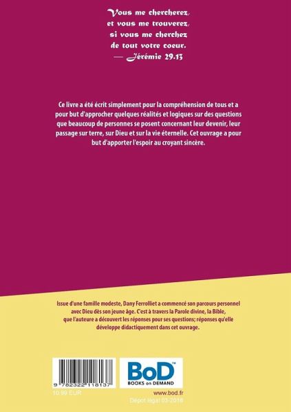 Ce livre a été écrit simplement pour la compréhension de tous et a pour but d'approcher quelques réalités et logiques sur des questions que beaucoup de personnes se posent concernant leur devenir, leur passage sur terre, sur Dieu et sur la vie éternelle. Cet ouvrage a pour but d'apporter l'espoir au croyant sincère.