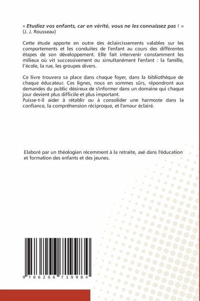« Etudiez vos enfants, car en vérité, vous ne les connaissez pas ! » (J. J. Rousseau) Cette étude apporte en outre des éclaircissements valables sur les comportements et les conduites de l'enfant au cours des différentes étapes de son développement. Elle fait intervenir constamment les milieux où vit successivement ou simultanément l'enfant : la famille, l'école, la rue, les groupes divers.Ce livre trouvera sa place dans chaque foyer, dans la bibliothèque de chaque éducateur. Ces lignes, nous en sommes sûrs, répondront aux demandes du public désireux de s'informer dans un domaine qui chaque jour devient plus difficile et plus important. Puisse-t-il aider à rétablir ou à consolider une harmoste dans la confiance, la compréhension réciproque, et l'amour éclairé.