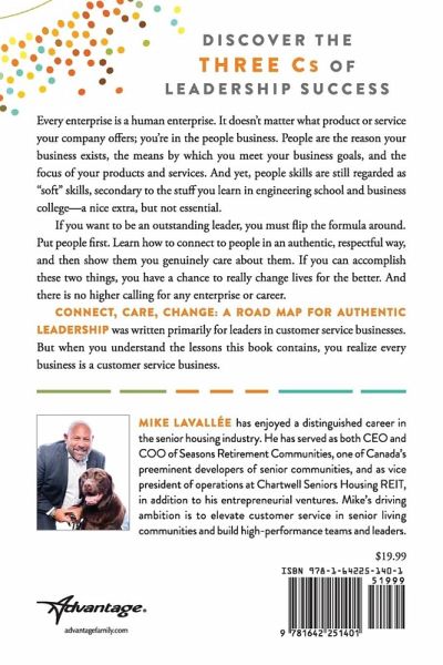 DISCOVER THE THREE Cs OF LEADERSHIP SUCCESS >If you want to be an outstanding leader, you must flip the formula around. Put people first. Learn how to connect to people in an authentic, respectful way, and then show them you genuinely care about them. If you can accomplish these two things, you have a chance to really change lives for the better. And there is no higher calling for any enterprise or career. CONNECT, CARE, CHANGE: A ROAD MAP FOR AUTHENTIC LEADERSHIP was written primarily for leaders in customer service businesses. But when you understand the lessons this book contains, you realize every business is a customer service business.