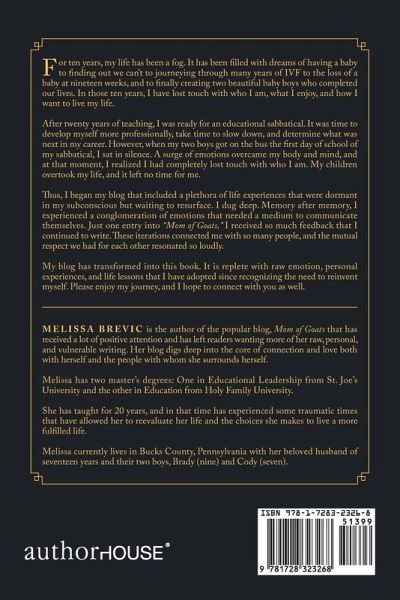 For ten years, my life has been a fog. It has been filled with dreams of having a baby to finding out we can't to journeying through many years of IVF to the loss of a baby at nineteen weeks, and to finally creating two beautiful baby boys who completed our lives. In those ten years, I have lost touch with who I am, what I enjoy, and how I want to live my life. After twenty years of teaching, I was ready for an educational sabbatical. It was time to develop myself more professionally, take time to slow down, and determine what was next in my career. However, when my two boys got on the bus the first day of school of my sabbatical, I sat in silence. A surge of emotions overcame my body and mind, and at that moment, I realized I had completely lost touch with who I am. My children overtook my life, and it left no time for me. Thus, I began my blog that included a plethora of life experiences that were dormant in my subconscious but waiting to resurface. I dug deep. Memory after memory, I experienced a conglomeration of emotions that needed a medium to communicate themselves. Just one entry into "Mom of Goats," I received so much feedback that I continued to write. These iterations connected me with so many people, and the mutual respect we had for each other resonated so loudly. My blog has transformed into this book. It is replete with raw emotion, personal experiences, and life lessons that I have adopted since recognizing the need to reinvent myself. Please enjoy my journey, and I hope to connect with you as well.
