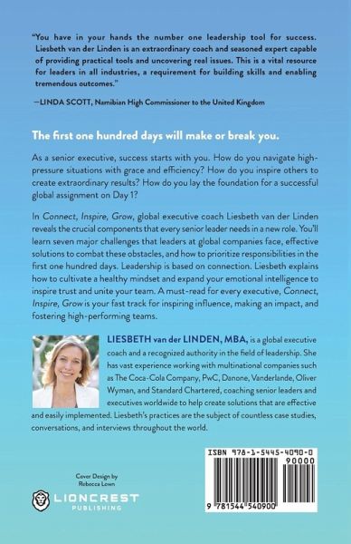 The first one hundred days will make or break you. As a senior executive, success starts with you. How do you navigate high-pressure situations with grace and efficiency? How do you inspire others to create extraordinary results? How do you lay the foundation for a successful global assignment on Day 1? In Connect, Inspire, Grow, global executive coach Liesbeth van der Linden reveals the crucial components that every senior leader needs in a new role. You'll learn seven major challenges that leaders at global companies face, effective solutions to combat these obstacles, and how to prioritize responsibilities in the first one hundred days. Leadership is based on connection. Liesbeth explains how to cultivate a healthy mindset and expand your emotional intelligence to inspire trust and unite your team. A must-read for every executive, Connect, Inspire, Grow is your fast track for inspiring influence, making an impact, and fostering high-performing teams.
