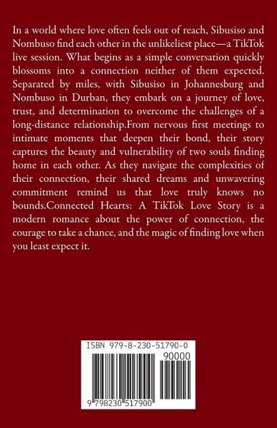 In a world where love often feels out of reach, Sibusiso and Nombuso find each other in the unlikeliest place-a TikTok live session. What begins as a simple conversation quickly blossoms into a connection neither of them expected. Separated by miles, with Sibusiso in Johannesburg and Nombuso in Durban, they embark on a journey of love, trust, and determination to overcome the challenges of a long-distance relationship.From nervous first meetings to intimate moments that deepen their bond, their story captures the beauty and vulnerability of two souls finding home in each other. As they navigate the complexities of their connection, their shared dreams and unwavering commitment remind us that love truly knows no bounds.Connected Hearts: A TikTok Love Story is a modern romance about the power of connection, the courage to take a chance, and the magic of finding love when you least expect it.