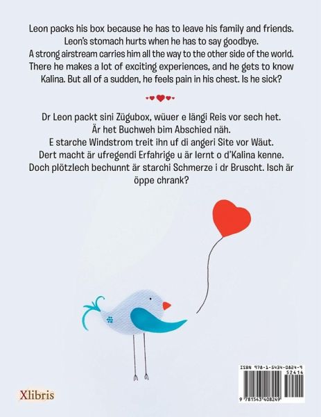 Leon packs his box because he has to leave his family and friends. Leon's stomach hurts when he has to say goodbye. A strong airstream carries him all the way to the other side of the world. There he makes a lot of exciting experiences, and he gets to know Kalina. But all of a sudden, he feels pain in his chest. Is he sick? Dr Leon packt sini Zügubox, wüuer e längi Reis vor sech het. Är het Buchweh bim Abschied näh. E starche Windstrom treit ihn uf di angeri Site vor Wäut. Dert macht är ufregendi Erfahrige u är lernt o d'Kalina kenne. Doch plötzlech bechunnt är starchi Schmerze i dr Bruscht. Isch är öppe chrank?