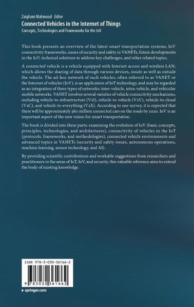 The book is divided into three parts: examining the evolution of IoV (basic concepts, principles, technologies, and architectures), connectivity of vehicles in the IoT (protocols, frameworks, and methodologies), connected vehicle environments and advanced topics in VANETs (security and safety issues, autonomous operations, machine learning, sensor technology, and AI).