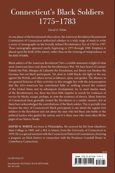 Black soldiers of the American Revolution? Not a credible statement in light of what most Americans have read about the Revolutionary War. We have heard of Casimir Pulaski the Pole, Marquis de Lafayette the Frenchman, and Baron von Steuben the German, but not black participants. Yet, close to 5,000 blacks did ¿ght in the war against the British, and others served as laborers, spies, and guides. The absence in our general histories of their activities in this struggle lies with the misconception that the Afro-American has contributed little or nothing towards the creation of the United States and its subsequent development, for in most studies made of the Revolutionary era, there has been little impulse to search for evidences of service by blacks, except perhaps to note the existence of slavery. Histories of Connecticut have generally treated the Revolution in a similar manner. Few of them have acknowledged the contributions of the black soldier. This is partially true because the story of Connecticut's black participant is one about the regular foot soldier in the Revolution and not about the men who led him into battle or the political leaders who guided the nation. And it is these men who most often fill the pages of our history books. As one phase of the Bicentennial observation, The American Revolution Bicentennial Commission of Connecticut has authorized scholars in a wide range of study to write a series of monographs on the broadly defined Revolutionary Era of 1763 to 1787. These monographs [appeared] yearly beginning in 1973 through 1980. Emphasis is placed upon the birth of the nation, rather than on the winning of independence on the field of battle.