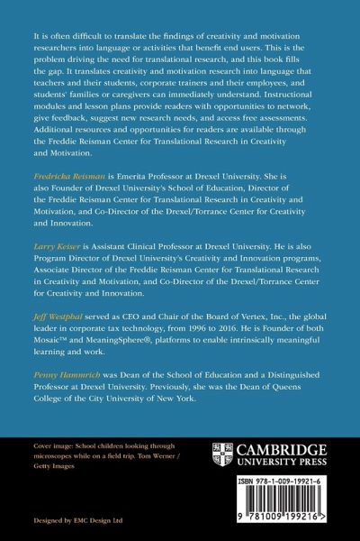1. Translational Education Research 2. Creativity 3. Motivation 4. Assessment Attributes and Related Guidelines 5. Assessment of Creativity 6. Assessment of Motivation 7. Additional Theorists Related to Creativity and Motivation 8. Neuroscience of Creativity, Mindfulness, and Mind/Brain/Education (MBE) 9. Creativity Modules 10. Motivation Modules 11. Dissemination and Communication Techniques for Translational Research 12. From Individual Compliance to Creative Collaboration: a business perspective.