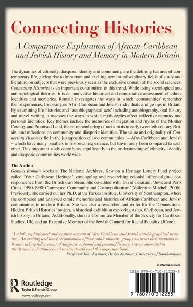 First published in 2006. The dynamics of ethnicity, diaspora, identity and community are the defining features of contemporary life, giving rise to important and exciting new interdisciplinary fields of study and literature on subjects that were previously seen as the exclusive domain of the social sciences. Connecting Histories is an important contribution to this trend. While using sociological and anthropological theories, its is an innovative historical and comparative assessment of ethnic identities and memories. Romain focuses on Afro-Caribbean and Jewish individuals and groups, investigating the ways in which 'communities' remember their experiences.