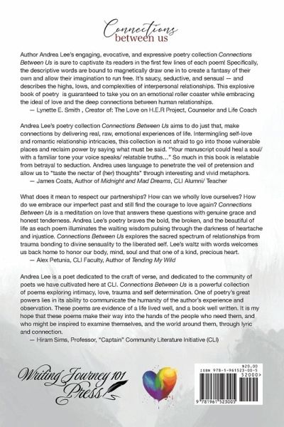About the Poet/Writer/ChefAndrea Lee is a multi-talented poet, chef, and author known for books such as The Power to Change the Way to Love Yourself, Connections Between Us andthe upcoming Expressions of Love, Feelings of Love, Courage & Betrayal. In addition to her adult-oriented work, Andrea is also venturing into the world of children's book writing. Her passion lies in helping others understand the positive connections they can foster with one another.Her works have been featured in various publications, including Stunning Poetry (Silent Spark Press), Poems in Praise of Libraries (Sims Library of Poetry), and 1619 Speaks (CLI Books). As the founder of www.writingjourney101.com, Andrea has developed platforms like Poetry in Motion, a literacy programs for teenagers and young adults, and Writing Journey 101 Press.As a host of a weekly poetry show on Let's Talk Radio, The Artist Connection, Andrea connects with her audience every Thursday at 8 pm PT. Born and raised in Los Angeles, she is a proud mother of four children and dedicated to empowering her community.Andrea is an alumn of the Community Literature Initiative, where she continues to be involved as a Teacher's Assistant. Andrea is a member of Poets in School with Los Angeles Poets Society. Her poetry has been showcased at various venues, such as Inner Health Care Ink and Holy Grounds Cafe, reflecting her commitment to sharing her passion for writing and fostering connections with others.