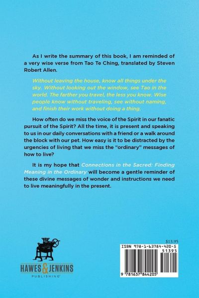 As I write the summary of this book, I am reminded of a very wise verse from Tao Te Ching, translated by Steven Robert Allen. Without leaving the house, know all things under the sky. Without looking out the window, see Tao in the world. The farther you travel, the less you know. Wise people know without traveling, see without naming, and finish their work without doing a thing. How often do we miss the voice of the Spirit in our fanatic pursuit of the Spirit? All the time, it is present and speaking to us in our daily conversations with a friend or a walk around the block with our pet. How easy is it to be distracted by the urgencies of living that we miss the "ordinary" messages of how to live? It is my hope that Connections in the Sacred: Finding Meaning in the Ordinary will become a gentle reminder of these divine messages of wonder and instructions we need to live meaningfully in the present.