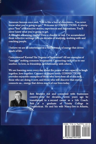 "Life is like a box of chocolates. You never know what you're going to get." CONNECTIONS is author Bob Brickley's ninety-piece box of moving, spiritual, and at times hilarious short, inspiring stories based on the experiences that have shaped his life. As a husband, a father, a business leader, a consultant, and now a Life Coach, the author's life mission has always been helping others successfully navigate the maze of options we all face in our lives so that we may then turn and assist others. CONNECTIONS exposes the invisible source of energy that drives much of our lives. Many trillions of frequencies seeking each other every day comprise the emotions of friendships, love of family, romance that make life joyful. Things that can only come from the heart. No words can describe them. You just know when they occur. CONNECTIONS was purposely written in short two-page pieces. "I've found most people today buy a book, read the first ten or fifteen pages. Put it down never to return... then claim they read the book." This is perfect for fast-paced lives, those with minimal reading time, and short attention spans. Pick it up and read a piece or two. Put it down and come back. The book is designed to fit well on your bedside table. While it may appear that CONNECTIONS has no central theme. Woven through all ninety pieces is the "thread", Above all, Love thyself. May this book in some way take you there.