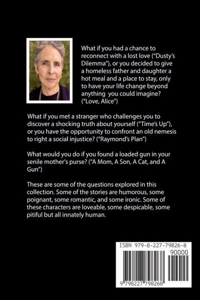 What if you had a chance to reconnect with a lost love ("Dusty's Dilemma"), or you decided to give a homeless father and daughter a hot meal and a place to stay, only to have your life change beyond anything you could imagine? ("Love, Alice") What if you met a stranger who challenges you to discover a shocking truth about yourself ("Time's Up"), or you have the opportunity to confront an old nemesis to right a social injustice? ("Raymond's Plan") What would you do if you found a loaded gun in your senile mother's purse?("A Mom, A Son, A Cat, and A Gun") These are some of the questions explored in this collection. Some of the stories are humorous, some poignant, some romantic, and some ironic. Some of these characters are loveable, some despicable, some pitiful but all innately human.
