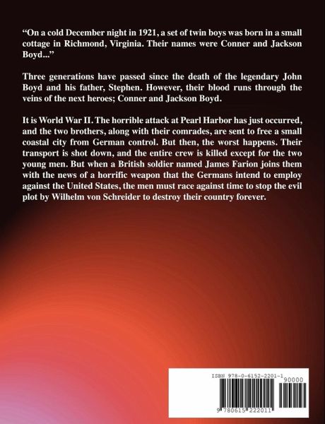 "On a cold December night in 1921, a set of twin boys was born in a small cottage in Richmond, Virginia. Their names were Conner and Jackson Boyd..." Three generations have passed since the death of the legendary John Boyd and his father, Stephen. However, their blood runs through the veins of the next heroes; Conner and Jackson Boyd. It is World War II. The horrible attack at Pearl Harbor has just occurred, and the two brothers, along with their comrades, are sent to free a small coastal city from German control. But then, the worst happens. Their transport is shot down, and the entire crew is killed except for the two young men. But when a British soldier named James Farion joins them with the news of a horrific weapon that the Germans intend to employ against the United States, the men must race against time to stop the evil plot by Wilhelm von Schreider to destroy their country forever.