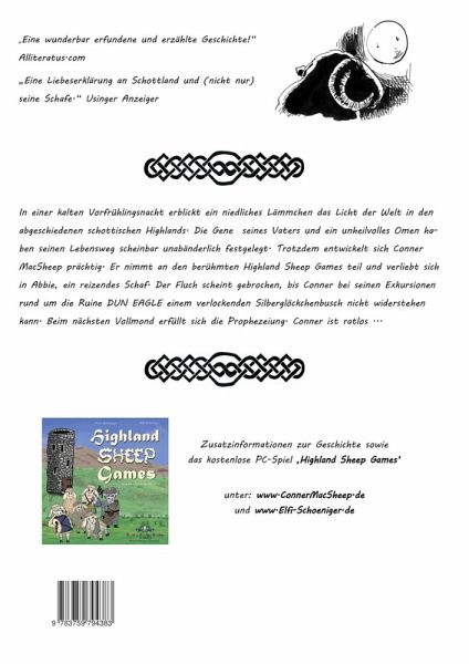 Wer ist nicht fasziniert von der geheimnisvollen Welt der schottischen Highlands, wo Männer im Rock mit todernster Mine und größtem Krafteinsatz Baumstämme werfen oder sich bei melancholischer Dudelsackmusik ihrem Wasser des Lebens, dem Whisky, hingeben? Der vierbeinige Held der Geschichte wird unter düsteren Prophezeiungen bei Vollmond in den einsamen Highlands geboren. Doch er entwickelt sich prächtig. Er ist wissbegierig und übermütig und entgegen aller Omen ein freundlicher Jungwidder. Er beweist sich bei den jährlich stattfindenden Highland Sheep Games und verliebt sich. Doch dann ereilen ihn die düsteren Vorhersagen - Spannung, Gänsehaut und Schmunzeln garantiert. Nach ihrem Roman Die Legende von Conner MacSheep war es der Autorin eine Herzensangelegenheit, den besonderen Darstellern bildliches Leben einzuhauchen, hervorragend umgesetzt von Johann Karpp.