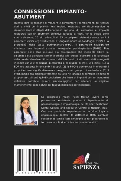 Questo libro si propone di valutare e confrontare i cambiamenti dei tessuti duri e molli peri-implantari tra impianti restaurati con disconnessioni e riconnessioni multiple dell'abutment (gruppo di controllo) e impianti restaurati con un abutment definitivo (gruppo di test). Per lo studio sono stati selezionati 20 siti edentuli di 13 partecipanti sistemicamente sani. I parametri clinici registrati erano il sanguinamento al sondaggio (BOP) e la profondità della tasca perimplantare (PIPD). Il parametro radiografico misurato era la perdita ossea marginale peri-implantare (PMBL). Due parametri sono stati misurati sia clinicamente che mediante CBCT: la distanza dalla giunzione cemento-smalto alla cresta alveolare e la larghezza della cresta alveolare. Al momento dell'intervento, i siti sono stati assegnati in modo casuale al gruppo di controllo o al gruppo di test . A 6 mesi, (1) la BOP era assente in entrambi i gruppi, (2) la PIPD è aumentata in entrambi i gruppi ed era significativamente maggiore nel gruppo di controllo e (3) il PMBL medio era significativamente più alto nel gruppo di controllo rispetto al gruppo test. Si può quindi concludere che l'uso di impianti con un abutment definitivo potrebbe essere più vantaggioso per ottenere un migliore mantenimento della salute dei tessuti marginali perimplantari.