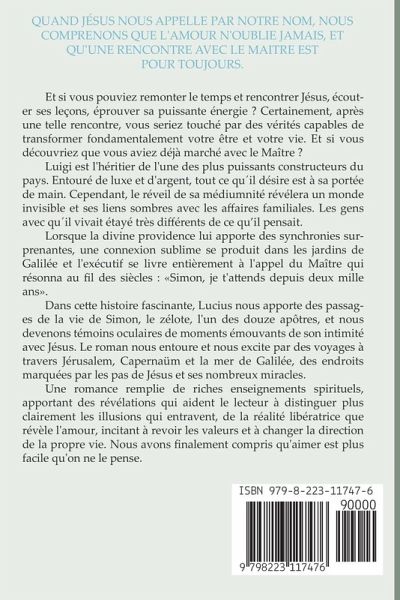 QUAND JÉSUS NOUS APPELLE PAR NOTRE NOM, NOUS COMPRENONS QUE L'AMOUR N'OUBLIE JAMAIS, ET QU'UNE RENCONTRE AVEC LE MAITRE EST POUR TOUJOURS. Et si vous pouviez remonter le temps et rencontrer Jésus, écouter ses leçons, éprouver sa puissante énergie ? Certainement, après une telle rencontre, vous seriez touché par des vérités capables de transformer fondamentalement votre être et votre vie. Et si vous découvriez que vous aviez déjà marché avec le Maître ? Luigi est l'héritier de l'une des plus puissants constructeurs du pays. Entouré de luxe et d'argent, tout ce qüil désire est à sa portée de main. Cependant, le réveil de sa médiumnité révélera un monde invisible et ses liens sombres avec les affaires familiales. Les gens avec qüil vivait étayé très différents de ce qu'il pensait. Lorsque la divine providence lui apporte des synchronies surprenantes, une connexion sublime se produit dans les jardins de Galilée et l'exécutif se livre entièrement à l'appel du Maître qui résonna au fil des siècles : «Simon, je t'attends depuis deux mille ans». Dans cette histoire fascinante, Lucius nous apporte des passages de la vie de Simon, le zélote, l'un des douze apôtres, et nous devenons témoins oculaires de moments émouvants de son intimité avec Jésus. Le roman nous entoure et nous excite par des voyages à travers Jérusalem, Capernaüm et la mer de Galilée, des endroits marquées par les pas de Jésus et ses nombreux miracles. Une romance remplie de riches enseignements spirituels, apportant des révélations qui aident le lecteur à distinguer plus clairement les illusions qui entravent, de la réalité libératrice que révèle l'amour, incitant à revoir les valeurs et à changer la direction de la propre vie. Nous avons finalement compris qu'aimer est plus facile qu'on ne le pense.