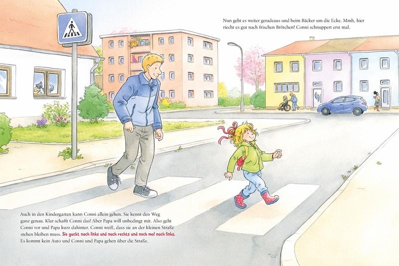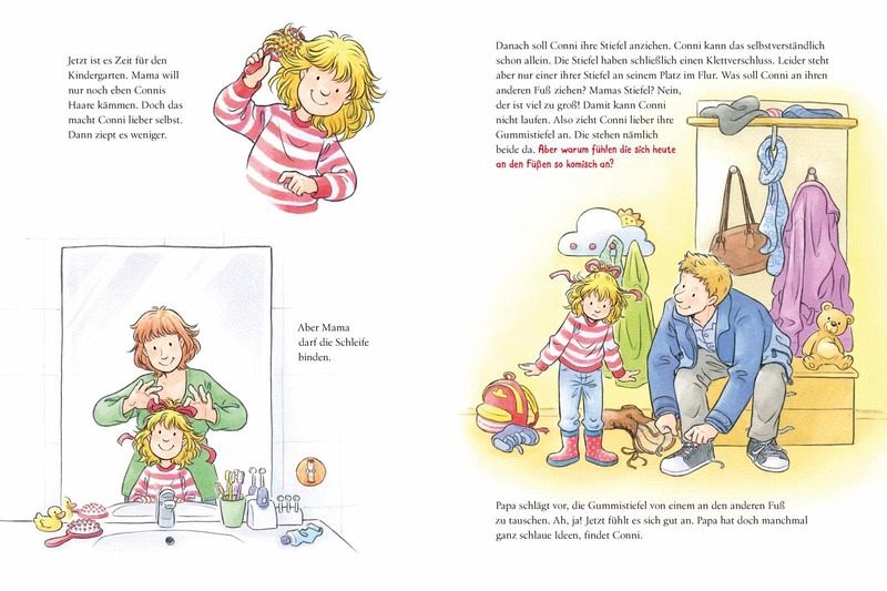 Klar kann sie sich alleine anziehen: sogar mit Stiefeln. Auch ihr Brötchen kann Conni bestreichen - sie kleckert dabei nur ein ganz kleines bisschen. Der Kakaofleck, der sich auf der Tischdecke ausbreitet, macht ihr nichts aus. Sogar in den Kindergarten geht Conni alleine. Na gut, Papa ist dabei und passt auf. Und an den Kita-Rucksack denkt er zum Glück auch! Was Conni alles schon kann, erzählt dieses Bilderbuch. Es ermuntert Kinder in ihren Streben nach Autonomie und zeigt, dass Dinge auch schiefgehen dürfen.