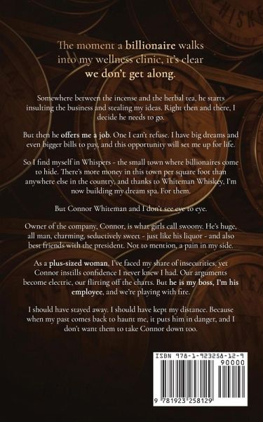 The moment a billionaire walks into my wellness clinic, it's clear we don't get along. Somewhere between the incense and the herbal tea, he starts insulting the business and stealing my ideas. Right then and there, I decide he needs to go. But then he offers me a job. One I can't refuse. I have big dreams and even bigger bills to pay, and this opportunity will set me up for life. So I find myself in Whispers - the small town where billionaires come to hide. There's more money in this town per square foot than anywhere else in the country, and thanks to Whiteman Whiskey, I'm now building my dream spa. For them. But Connor Whiteman and I don't see eye to eye. Owner of the company, Connor, is what girls call swoony. He's huge, all man, charming, seductively sweet - just like his liquor - and also best friends with the president. Not to mention, a pain in my side. As a plus-sized woman, I've faced my share of insecurities, yet Connor instills confidence I never knew I had. Our arguments become electric, our flirting off the charts. But he is my boss, I'm his employee, and we're playing with fire. I should have stayed away. I should have kept my distance. Because when my past comes back to haunt me, it puts him in danger, and I don't want them to take Connor down too.