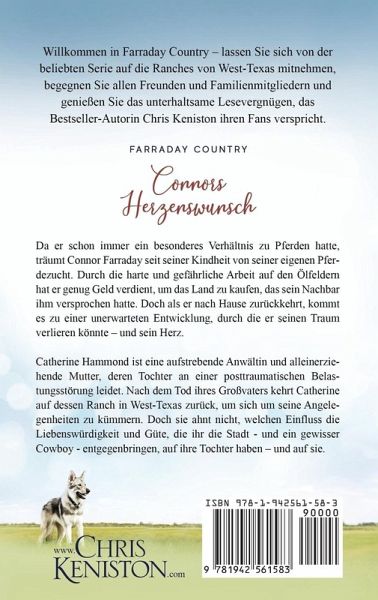 Da er schon immer ein besonderes Verhältnis zu Pferden hatte, träumt Connor Farraday seit seiner Kindheit von seiner eigenen Pferdezucht. Durch die harte und gefährliche Arbeit auf den Ölfeldern hat er genug Geld verdient, um das Land zu kaufen, das sein Nachbar ihm versprochen hatte. Doch als er nach Hause zurückkehrt, kommt es zu einer unerwarteten Entwicklung, durch die er seinen Traum verlieren könnte - und sein Herz. Catherine Hammond ist eine aufstrebende Anwältin und alleinerziehende Mutter, deren Tochter an einer posttraumatischen Belastungsstörung leidet. Nach dem Tod ihres Großvaters kehrt Catherine auf dessen Ranch in West-Texas zurück, um sich um seine Angelegenheiten zu kümmern. Doch sie ahnt nicht, welchen Einfluss die Liebenswürdigkeit und Güte, die ihr die Stadt - und ein gewisser Cowboy - entgegenbringen, auf ihre Tochter haben - und auf sie. ¿Willkommen in Farraday Country - lassen Sie sich von der beliebten Serie auf die Ranches von West-Texas mitnehmen, begegnen Sie allen Freunden und Familienmitgliedern und genießen Sie das unterhaltsame Lesevergnügen, das Bestseller-Autorin Chris Keniston ihren Fans verspricht. Weitere Bücher der Farraday-Country-Reihe: Adams geheimnisvolle Braut Brooks' verbotene Sehnsucht Connors Herzenswunsch Declans überraschende Begegnung Ethans Himmel auf Erden Finns zweite Chance Graces trautes Heim