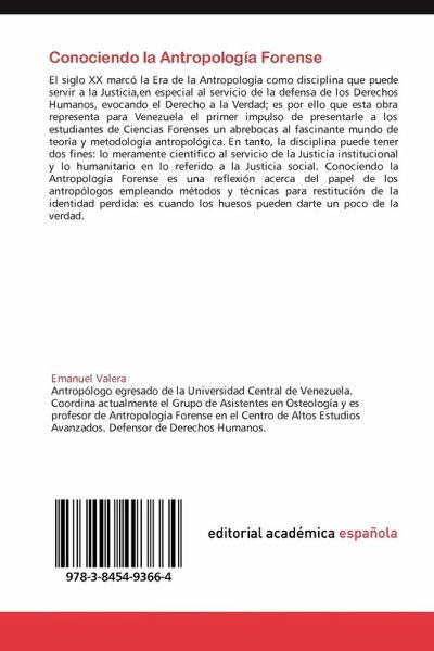 El siglo XX marcó la Era de la Antropología como disciplina que puede servir a la Justicia,en especial al servicio de la defensa de los Derechos Humanos, evocando el Derecho a la Verdad; es por ello que esta obra representa para Venezuela el primer impulso de presentarle a los estudiantes de Ciencias Forenses un abrebocas al fascinante mundo de teoría y metodología antropológica. En tanto, la disciplina puede tener dos fines: lo meramente científico al servicio de la Justicia institucional y lo humanitario en lo referido a la Justicia social. Conociendo la Antropología Forense es una reflexión acerca del papel de los antropólogos empleando métodos y técnicas para restitución de la identidad perdida: es cuando los huesos pueden darte un poco de la verdad.