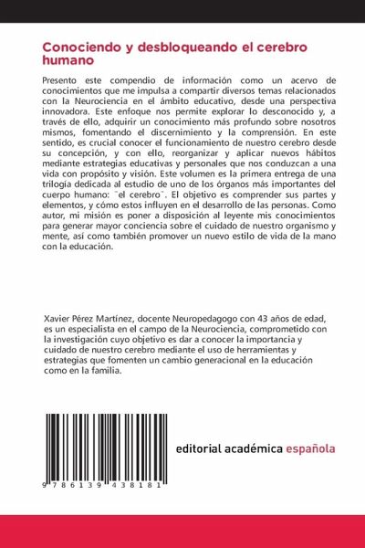 Presento este compendio de información como un acervo de conocimientos que me impulsa a compartir diversos temas relacionados con la Neurociencia en el ámbito educativo, desde una perspectiva innovadora. Este enfoque nos permite explorar lo desconocido y, a través de ello, adquirir un conocimiento más profundo sobre nosotros mismos, fomentando el discernimiento y la comprensión. En este sentido, es crucial conocer el funcionamiento de nuestro cerebro desde su concepción, y con ello, reorganizar y aplicar nuevos hábitos mediante estrategias educativas y personales que nos conduzcan a una vida con propósito y visión. Este volumen es la primera entrega de una trilogía dedicada al estudio de uno de los órganos más importantes del cuerpo humano: ¿el cerebrö. El objetivo es comprender sus partes y elementos, y cómo estos influyen en el desarrollo de las personas. Como autor, mi misión es poner a disposición al leyente mis conocimientos para generar mayor conciencia sobre el cuidado de nuestro organismo y mente, así como también promover un nuevo estilo de vida de la mano con la educación.