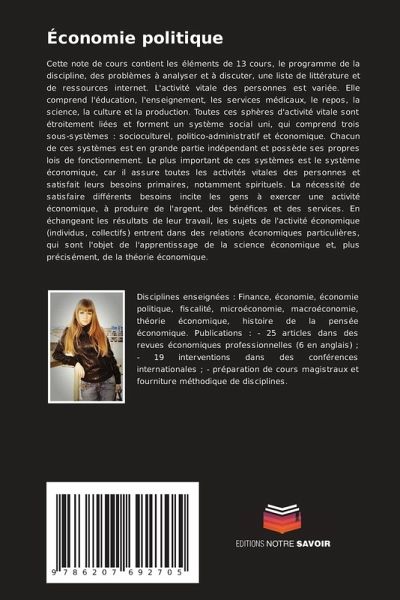 Cette note de cours contient les éléments de 13 cours, le programme de la discipline, des problèmes à analyser et à discuter, une liste de littérature et de ressources internet. L'activité vitale des personnes est variée. Elle comprend l'éducation, l'enseignement, les services médicaux, le repos, la science, la culture et la production. Toutes ces sphères d'activité vitale sont étroitement liées et forment un système social uni, qui comprend trois sous-systèmes : socioculturel, politico-administratif et économique. Chacun de ces systèmes est en grande partie indépendant et possède ses propres lois de fonctionnement. Le plus important de ces systèmes est le système économique, car il assure toutes les activités vitales des personnes et satisfait leurs besoins primaires, notamment spirituels. La nécessité de satisfaire différents besoins incite les gens à exercer une activité économique, à produire de l'argent, des bénéfices et des services. En échangeant les résultats de leur travail, les sujets de l'activité économique (individus, collectifs) entrent dans des relations économiques particulières, qui sont l'objet de l'apprentissage de la science économique et, plus précisément, de la théorie économique.