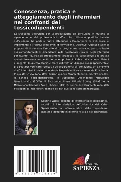 La crescente attenzione per la preparazione dei consulenti in materia di dipendenze e dei professionisti affini che utilizzano pratiche basate sull'evidenza ha portato nuova attenzione all'importanza di sviluppare e implementare i relativi programmi di formazione. Obiettivo: Questo studio si propone di esaminare l'impatto di un programma educativo personalizzato sui comportamenti di dipendenza sulle prestazioni cliniche degli infermieri per quanto riguarda gli atteggiamenti terapeutici, le conoscenze e la pratica quando lavorano con clienti che hanno problemi di abuso di sostanze. Metodi e soggetti: In questo studio è stato utilizzato un disegno quasi sperimentale pre-post per verificare l'efficacia del programma di formazione. Un campione di 40 infermieri è stato reclutato dall'ospedale di salute mentale El Abbasia. In questo studio sono stati utilizzati quattro strumenti per la raccolta dei dati: la scheda socio-demografica, il Substance Dependence Knowledge Questionnaire (SDKQ), il Substance Abuse Attitude Survey (SAAS) e la Motivational Interview Skills Checklist (MISC). I primi due strumenti sono stati sviluppati dai ricercatori, mentre gli altri due sono stati standardizzati.