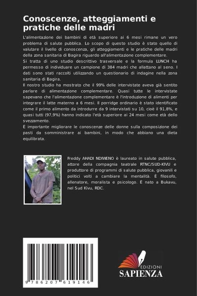 L'alimentazione dei bambini di età superiore ai 6 mesi rimane un vero problema di salute pubblica. Lo scopo di questo studio è stato quello di valutare il livello di conoscenza, gli atteggiamenti e le pratiche delle madri della zona sanitaria di Bagira riguardo all'alimentazione complementare. Si tratta di uno studio descrittivo trasversale e la formula LUNCH ha permesso di individuare un campione di 384 madri che allattano al seno. I dati sono stati raccolti utilizzando un questionario di indagine nella zona sanitaria di Bagira. Il nostro studio ha mostrato che il 99% delle intervistate aveva già sentito parlare di alimentazione complementare. Quasi tutte le intervistate sapevano che l'alimentazione complementare è l'introduzione di alimenti per integrare il latte materno a 6 mesi. Il porridge ordinario è stato identificato come il primo alimento da introdurre da 9 intervistati su 10, cioè il 91,8%, e quasi tutti (97,9%) hanno indicato l'età superiore ai 24 mesi come età dello svezzamento.È importante migliorare le conoscenze delle donne sulla composizione dei pasti da somministrare ai bambini, in modo che abbiano una dieta equilibrata.