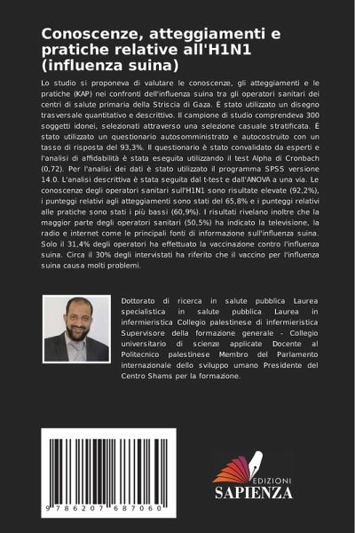 Lo studio si proponeva di valutare le conoscenze, gli atteggiamenti e le pratiche (KAP) nei confronti dell'influenza suina tra gli operatori sanitari dei centri di salute primaria della Striscia di Gaza. È stato utilizzato un disegno trasversale quantitativo e descrittivo. Il campione di studio comprendeva 300 soggetti idonei, selezionati attraverso una selezione casuale stratificata. È stato utilizzato un questionario autosomministrato e autocostruito con un tasso di risposta del 93,3%. Il questionario è stato convalidato da esperti e l'analisi di affidabilità è stata eseguita utilizzando il test Alpha di Cronbach (0,72). Per l'analisi dei dati è stato utilizzato il programma SPSS versione 14.0. L'analisi descrittiva è stata seguita dal t-test e dall'ANOVA a una via. Le conoscenze degli operatori sanitari sull'H1N1 sono risultate elevate (92,2%), i punteggi relativi agli atteggiamenti sono stati del 65,8% e i punteggi relativi alle pratiche sono stati i più bassi (60,9%). I risultati rivelano inoltre che la maggior parte degli operatori sanitari (50,5%) ha indicato la televisione, la radio e internet come le principali fonti di informazione sull'influenza suina. Solo il 31,4% degli operatori ha effettuato la vaccinazione contro l'influenza suina. Circa il 30% degli intervistati ha riferito che il vaccino per l'influenza suina causa molti problemi.
