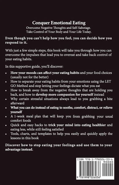 Have you ever wondered what it would take to finally stop struggling with emotional eating? Do you have trouble controlling what and how much you eat? Your emotions have more impact on your body than you realize - influencing what, when, and how much you eat, as well as your ability to stick to a healthy lifestyle. That's because your feelings can dictate your behavior, especially if you don't know how to manage them. Emotional eating is when we eat not to fill our hunger but as a response to how we're feeling. We eat to feel better, to distract ourselves, or to release stress. But even though you can't help how you feel, you can decide how you respond to it. And you can learn how to respond more consciously to your emotions so it never holds power over your actions again. All it takes is a straightforward method that will show you how to take control of your thoughts, be aware of your triggers, and listen to your emotions and needs. With just a few simple steps, this book will take you through how you can overcome the impulses that lead you to overeat and take back control of your eating habits. In this supportive guide, here is just a fraction of what you will discover: ¿ How your moods can affect your eating habits and your food choices (usually not for the better) ¿ How to separate your eating habits from your emotions using the LET GO Method and stop letting your feelings dictate what you eat ¿ How to break away from the negative thoughts that are holding you back, and how to develop more compassion for yourself instead ¿ How to distinguish between real hunger that you need to fill with food... and emotional hunger that shouldn't be filled by eating ¿ Why certain stressful situations always lead to you grabbing a bite afterwards ¿ What you can do instead of eating to soothe, comfort, distract, or relieve yourself ¿ How to eat mindfully and appreciate your food, and how eating this way can help you avoid overeating ¿ Quick and easy hacks to trick your mind into eating healthier and eating less while still feeling satisfied ¿ Tools, charts, and templates to help you easily and quickly apply the lessons in this book And much more. Instead of pushing down or ignoring your feelings, you need to pay attention to them and find out what it is you really need. Your emotions are trying to tell you something. It's time to stop muffling their voice with food and start listening to what your feelings are saying. You'll find yourself fulfilled not just physically but emotionally as well.