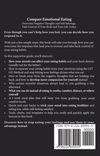 Have you ever wondered what it would take to finally stop struggling with emotional eating? Do you have trouble controlling what and how much you eat? Your emotions have more impact on your body than you realize - influencing what, when, and how much you eat, as well as your ability to stick to a healthy lifestyle. That's because your feelings can dictate your behavior, especially if you don't know how to manage them. Emotional eating is when we eat not to fill our hunger but as a response to how we're feeling. We eat to feel better, to distract ourselves, or to release stress. But even though you can't help how you feel, you can decide how you respond to it. And you can learn how to respond more consciously to your emotions, so it never holds power over your actions again. All it takes is a straightforward method that will show you how to take control of your thoughts, be aware of your triggers, and listen to your emotions and needs. With just a few simple steps, this book will take you through how you can overcome the impulses that lead you to overeat and take back control of your eating habits. In this supportive guide, here is just a fraction of what you will discover: How your moods can affect your eating habits and your food choices (usually not for the better) How to separate your eating habits from your emotions using the LET GO Method and stop letting your feelings dictate what you eat How to break away from the negative thoughts that are holding you back, and how to develop more compassion for yourself instead How to distinguish between real hunger that you need to fill with food... and emotional hunger that shouldn't be filled by eating Why certain stressful situations always lead to you grabbing a bite afterwards What you can do instead of eating to soothe, comfort, distract, or relieve yourself How to eat mindfully and appreciate your food, and how eating this way can help you avoid overeating Quick and easy hacks to trick your mind into eating healthier and eating less, while still feeling satisfied Tools, charts, and templates to help you easily and quickly apply the lessons in this book And much more. As a bonus, included is a 1-week meal plan that will keep you from grabbing your usual comfort foods. Instead of pushing down or ignoring your feelings, you need to pay attention to them and find out what it is you really need. Your emotions are trying to tell you something. It's time to stop muffling their voice with food and start listening to what your feelings are saying. You'll find yourself fulfilled not just physically, but emotionally as well.