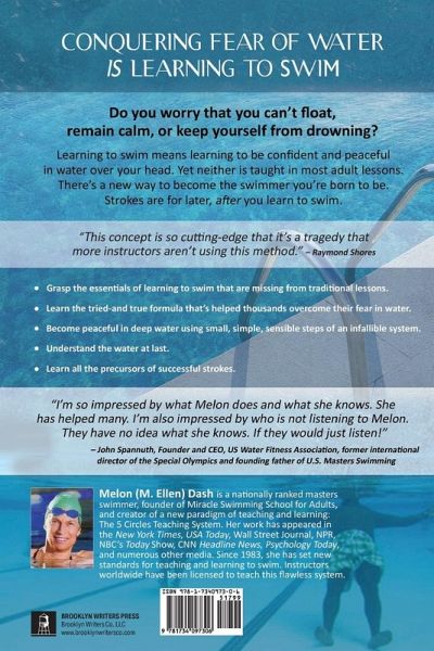 Overcome Fear in Water - Become Safe, Confident, and in Control Yes, you can learn to swim with a book. What You'll Learn This book guides you through every non-threatening step to: * Overcome fear in water from the inside out * Focus on the key to overcoming fear * Learn to trust yourself in water * Learn to be in control in water * Put your face in, happily * Float calmly and comfortably, front and back and stand up * Understand how water works and come to know it * Move through shallow water with ease * Change direction, roll over * Feel deep water hold you up * Remain in control in deep water * Stay comfortable at all times * Why you'll learn sooner if you don't push yourself * Progress through a proven, step-by-step system that works every time . Despite commonly held beliefs, strokes and treading are unrelated to overcoming fear. They don't make you comfortable in deep water- therefore they are not included. They are easily learned and sustainable once you're no longer afraid. Learn all the ideas, practices, and skills of the the author's flagship courses, the gold standard in adult swimming lessons with 6,000 graduates to date. The inner process of healing fear starts on land. As your understanding grows, water skills are introduced. Why the System Works When afraid adults are given what they need, their complete success is inevitable and unstoppable. Learn a new system of teaching and learning. Proven over 40 years by countless classes, this system works every time. * No pressure. * No skipped steps. * No fear. One day, all lessons-swimming and otherwise-will be taught this way. Start your transformation to comfort in any depth of water today. "The book is amazing. I am so grateful I found it because it speaks to the heart of me. I am taking swim lessons at the local rec center and while they are terrific for what they are, they are exactly as you describe. Without your book and video, I would not have the courage and confidence to speak up and tell the instructors what I need. To their credit, they listen! They help me and I think I am helping them by being the student I've become thanks to your enlightening me."--Gratefully, PW Miracle Swimming School for Adults founder Dash's work recently appeared on Suncoast View (ABC 7 TV Sarasota), International Business Times, Sarasota Magazine, Authority Magazine, Association of Aquatic Professionals Newsletter, and The Observer (Sarasota FL). Miracle Swimming has been endorsed by Diana Nyad, the swimmer of the 111 miles from Cuba to Key West whose story is told in the Netflix movie, NYAD (with Jodie Foster, Annette Bening).