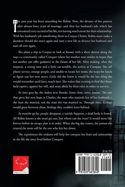 The past year has been unsettling for Robin. First, the divorce of her parents after almost forty years of marriage, and then her husband’s job, which has consumed every second of his life, not leaving much room for their relationship. With her husband’s job transferring them to Corpus Christi, Robin must make a decision: should she move again and start a new life or divorce her husband and start all over again. She plans a trip to Corpus to look at houses with a short detour along the way—a community called Conquer where her mother now resides in hopes that her mother can offer guidance in the future of her life. After making, what she suspects, a wrong turn and a little car trouble, she arrives at Conquer. No cell phone service, strange people, and unable to locate her mom, she stops for lunch to figure out her next move. Little did she know it would be the last thing she would remember until later, much later. She wakes that evening to find she’s been held captive, against her will, and must abide by their rules in order to survive. As time goes by, she makes new friends. Some close, some distant. The one that gives her new hope is Charles, the man who reminds her of her husband—the man she married, not the man she was married to. Through time, feelings would grow between them, feelings they couldn’t leave behind. As months go by, people disappear, a suicide happens, a dead body is found. All Robin knows is she must get out, but whom can she trust? It would seem like forever before an escape plan is in order. When the big day comes, the person she trusted the most will be the one who lets her down. The experiences she endures will help her conquer her fears and animosities in the life she once lived before Conquer.