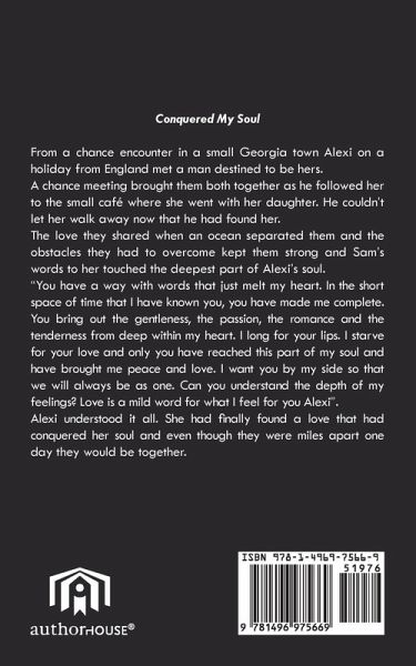 Conquered My Soul From a chance encounter in a small Georgia town Alexi on a holiday from England met a man destined to be hers. A chance meeting brought them both together as he followed her to the small café where she went with her daughter. He couldn't let her walk away now that he had found her. The love they shared when an ocean separated them and the obstacles they had to overcome kept them strong and Sam's words to her touched the deepest part of Alexi's soul. "You have a way with words that just melt my heart. In the short space of time that I have known you, you have made me complete. You bring out the gentleness, the passion, the romance and the tenderness from deep within my heart. I long for your lips. I starve for your love and only you have reached this part of my soul and have brought me peace and love. I want you by my side so that we will always be as one. Can you understand the depth of my feelings? Love is a mild word for what I feel for you Alexi".