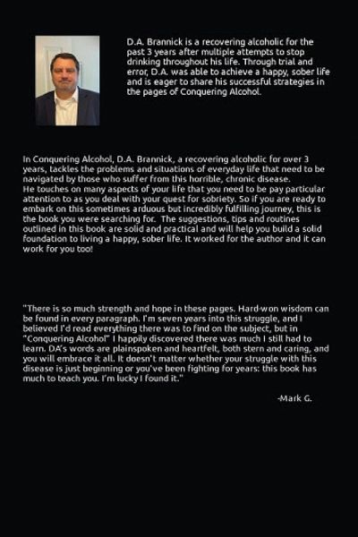 In Conquering Alcohol, D.A. Brannick, a recovering alcoholic for over 3 years, tackles the problems and situations of everyday life that need to be navigated by those who suffer from this horrible, chronic disease. He touches on many aspects of your life that you need to be pay particular attention to as you deal with your quest for sobriety. These are:Defining Alcoholism Powerful and Imperative Mindsets for Successful Recovery Programs to Aid in Recovery Essential Coping Skills Self-awareness and Acceptance Practices People, Places and Things That Can Hinder or Help Your Progress Daily Practices and Routines Science and Medicine Available for Recovering Addicts And Much More Conquering Alcohol emphasizes recovery as a long-term commitment or process because recovery is just that: a process. It will not happen overnight. There is no quick fix. That is the exact mindset that people have who relapsed into their old habits and way of thinking. This process takes time. It takes practice. And it takes unwavering patience and dedication. Without all these attributes in place, you will not succeed. Read the book through to the end. Try and get a feel for what you can apply to your life to help you move forward in your recovery. Then go back to the individual chapters and envision how you will incorporate that particular area of focus into your daily routine. Brannick suggests using the book as a sort of guide through the evolution of your recovery. Take on one area at a time before you move onto the next. By the end of this book, you will understand that every journey begins with the decision to take the first step, which must be taken very seriously. For people who do not suffer from this disease, you will often hear, "They just have to stop drinking, and that's it!' However, we, as alcoholics, know that it is not that simple. Alcoholism is not a defect of character. It is not caused by being morally corrupt or lacking willpower. It is so much more than that. It is a disease that has been proven to be somewhat genetically based while also being environmentally and behaviorally influenced. D.A. Brannick's goal is to help you understand that fact so you can act accordingly and live a happy, alcohol-free life. Lastly, there is one truth that you must always have in the back of your mind and never let escape as you read through these pages and perhaps get a little overwhelmed at times and it is the most crucial point of all; Your life depends on your recovery. Unfortunately, you and I suffer from a deadly disorder that needs to be treated every day. It can be the difference between life and death. So if you are ready to embark on this sometimes arduous but incredibly fulfilling journey, this is the book you were searching for. The suggestions, tips and routines outlined in this book are solid and practical and will help you build a solid foundation to living a happy, sober life. It worked for the author and it can work for you too!