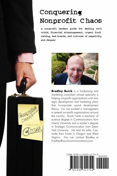Conquering Nonprofit Chaos is a nonprofit leader's guide for dealing with crisis, financial mismangement, urgent fundraising, bad boards, and cultures of negativity and despair. Author Bradley Burck provides readers a valuable reference to help identify and correct poor nonprofit management practices that contribute to chaos and can ultimately lead to crisis.