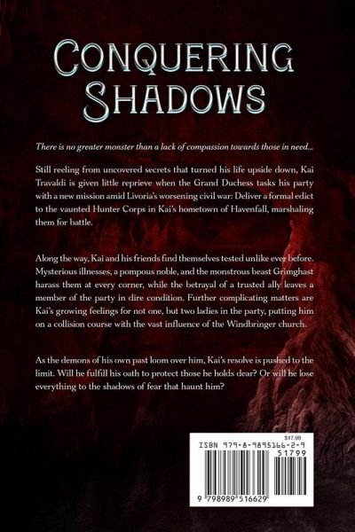 There is no greater monster than a lack of compassion towards those in need... Still reeling from uncovered secrets that turned his life upside down, Kai Travaldi is given little reprieve when the Grand Duchess tasks his party with a new mission amid Livoria's worsening civil war: Deliver a formal edict to the vaunted Hunter Corps in Kai's hometown of Havenfall, marshaling them for battle. Along the way, Kai and his friends find themselves tested unlike ever before. Mysterious illnesses, a pompous noble, and the monstrous beast Grimghast harass them at every corner, while the betrayal of a trusted ally leaves a member of the party in dire condition. Further complicating matters are Kai's growing feelings for not one, but two ladies in the party, putting him on a collision course with the vast influence of the Windbringer church. As the demons of his own past loom over him, Kai's resolve is pushed to the limit. Will he fulfill his oath to protect those he holds dear? Or will he lose everything to the shadows of fear that haunt him?