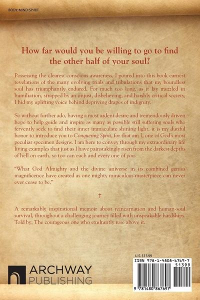 How far would you be willing to go to find the other half of your soul? Possessing the clearest conscious awareness, I poured into this book earnest revelations of the many evolving trials and tribulations that my boundless soul has triumphantly endured. For much too long, as it lay muzzled in humiliation, strapped by an unjust, disbelieving, and harshly critical society, I hid my uplifting voice behind depriving drapes of indignity. So without further ado, having a most ardent desire and tremendously driven hope to help guide and inspire as many as possible still suffering souls who fervently seek to find their inner immaculate shining light, it is my dutiful honor to introduce you to Conquering Spirit, for that am I, one of God's most peculiar specimen designs. I am here to convey through my extraordinary life living examples that just as I have painstakingly risen from the darkest depths of hell on earth, so too can each and every one of you. "What God Almighty and the divine universe in its combined genius magnificence have created as one mighty miraculous masterpiece can never ever cease to be."